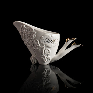 Blaue Blume, the blue flower, is a central symbol of Romanticism, representing desire, love, and the metaphysical striving for the infinite and unreachable. We can't think of anything more romantic than Undergrowth Design's Blaue Blume Tea set - delicate porcelain with a white lace pattern and a hot pair of legs with dainty gold shoes for the handle? Here at last is a tea set even the men in your life can appreciate!
