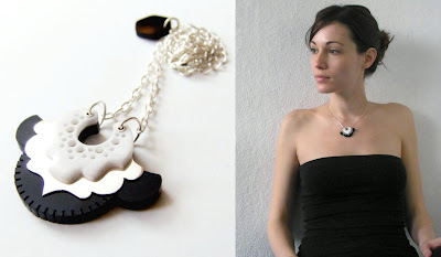 It's this synergistic blending of materials that is so evident in Kyoko's jewelry - hand cut resin is paired with wood, brass and silver to create pieces that are reminiscent of both Victorian lace patterns and vintage Art Deco jewelry. A beautiful example of this is our favorite piece; the reversible Dinner Party Necklace. Inspired by a toy car model kit and components, Kyoko's translation is playful without being childish, elegant without being fussy, and foxy without being floozy.